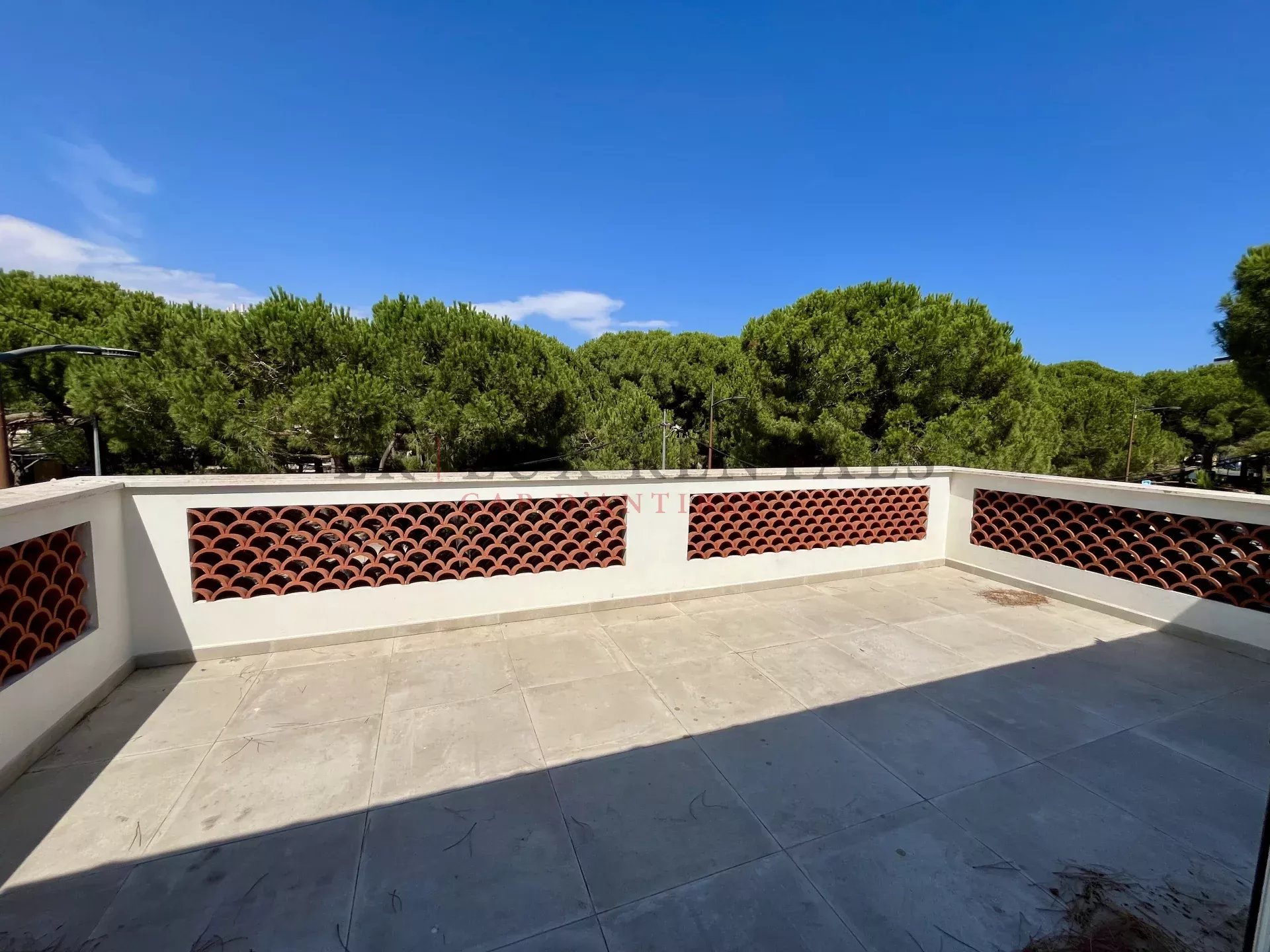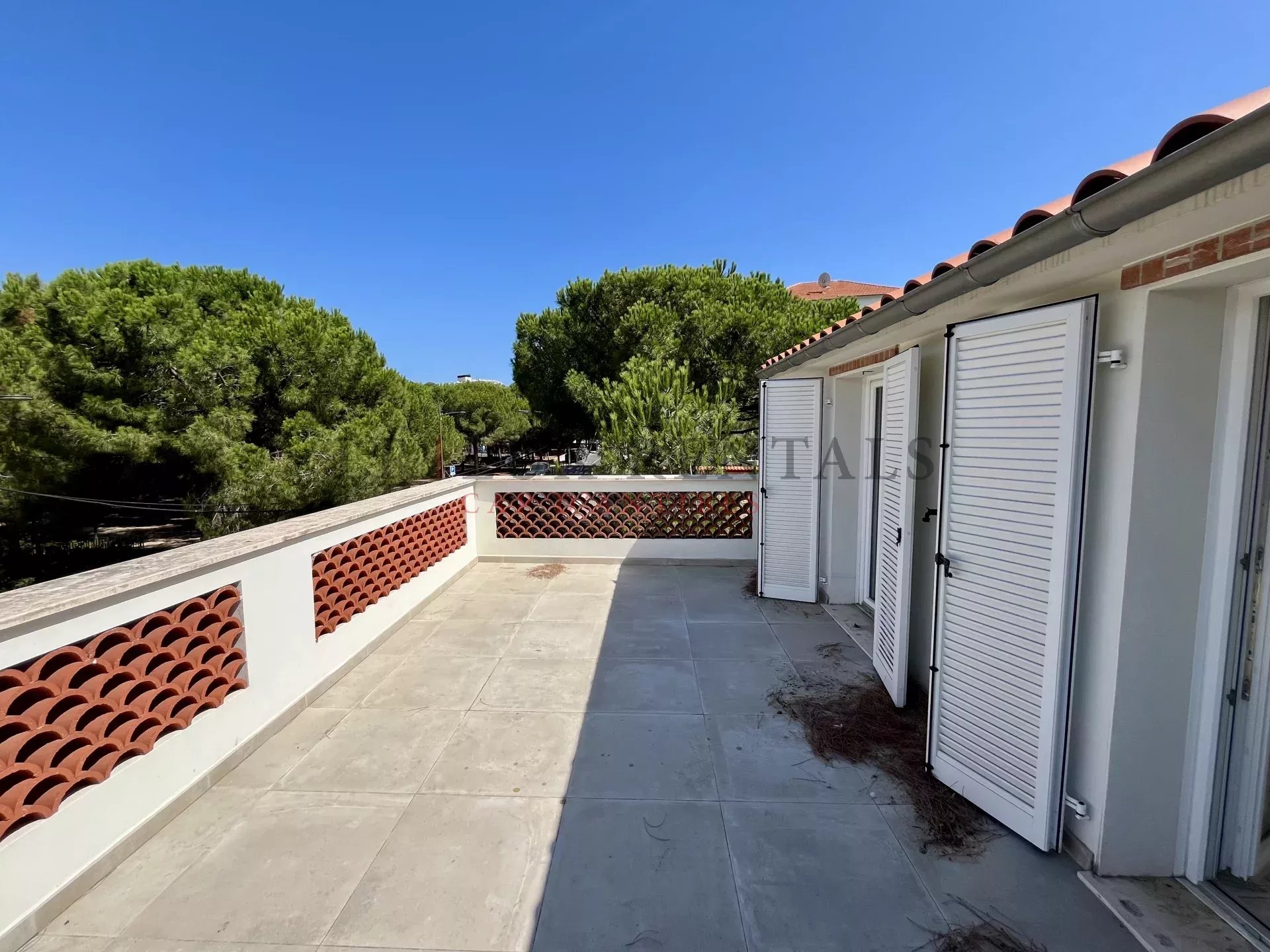 Étage supérieur : superbe chambre avec salle de douche attenante, ouvrant sur deux grandes terrasses, dont l’une offre une belle vue mer et la seconde sur la Pinède.
